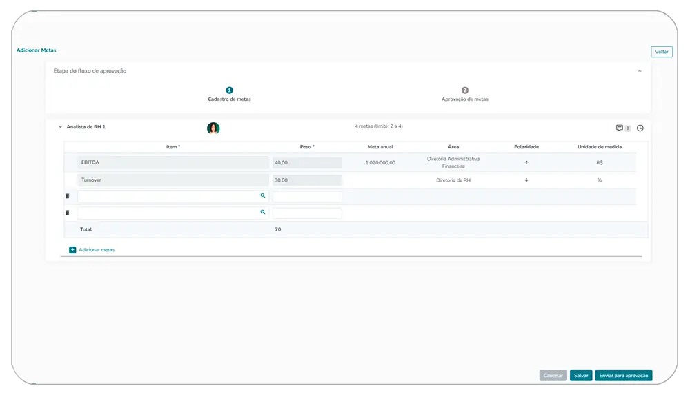 - Metas individuais se conectam à remuneração variável e à avaliação de performance.