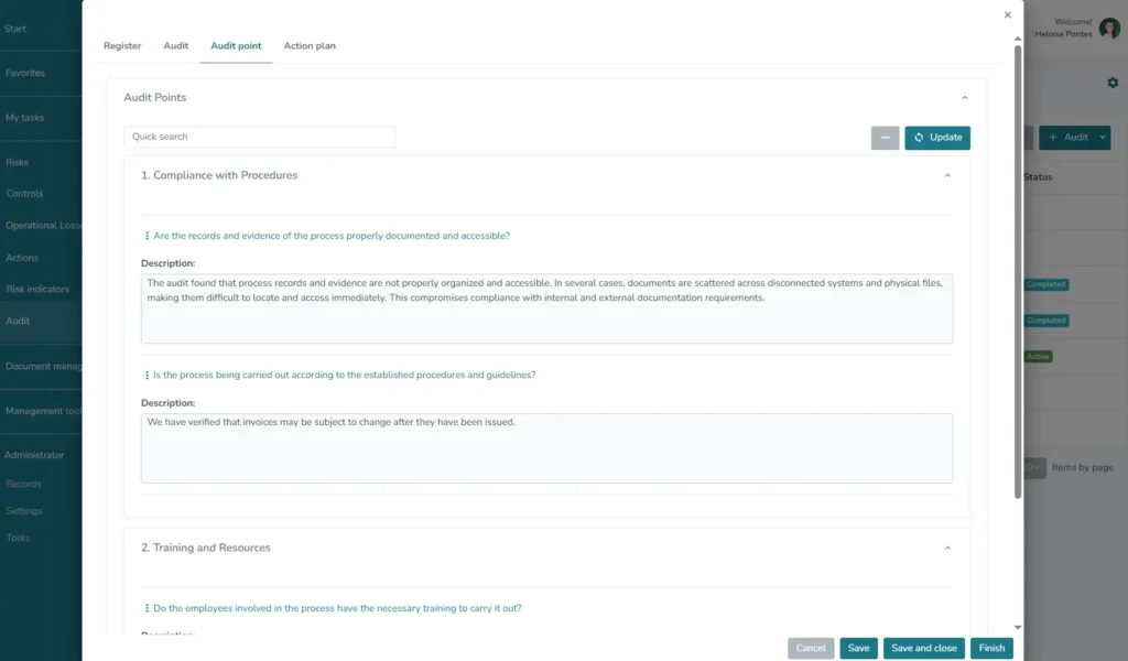 Actio’s Audit Management Software spreadsheets and parallel controls by centralizing evidence, analyses, and audit findings in a structured environment, with organized records for each item and full tracking of deadlines and corrective actions.