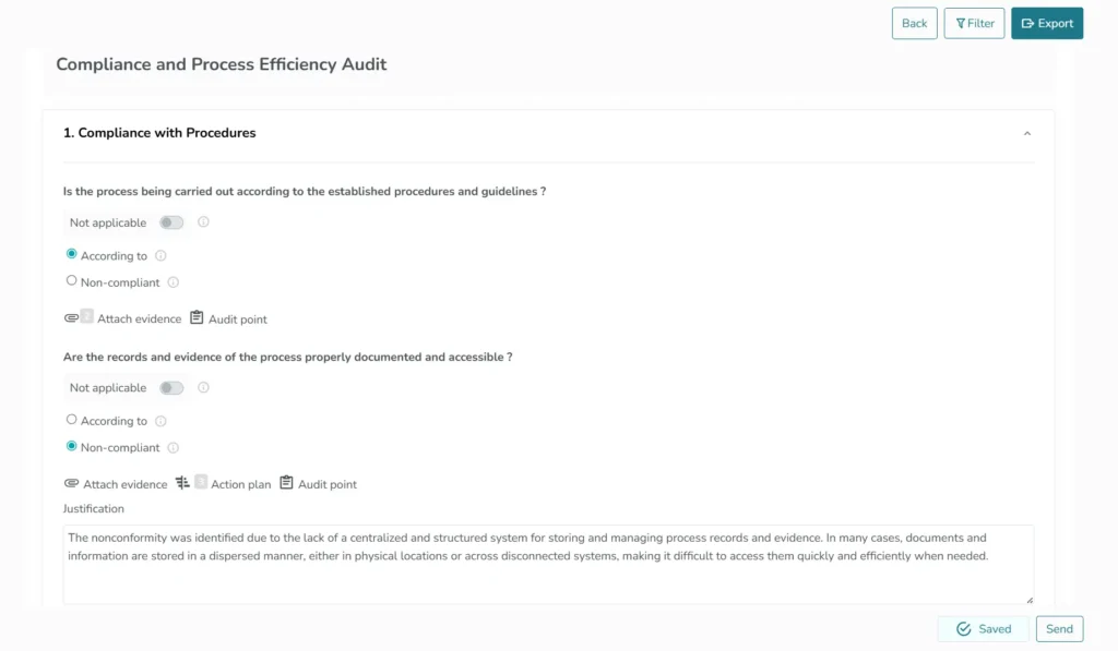 Execute audits through checklists with configurable scoring scales, required justifications per response, and optional or mandatory action plan rules based on results—standardizing execution, improving the quality of evidence, and driving remediation whenever nonconformities are identified.