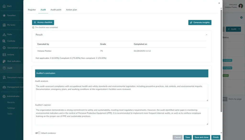 Spreadsheets and documents record information, but they don’t support audit management. The main bottlenecks lie in standardizing execution, managing dispersed evidence, consolidating findings, and following up on corrective actions. A software solution organizes the entire audit cycle within a single workflow, providing traceability and reducing rework.