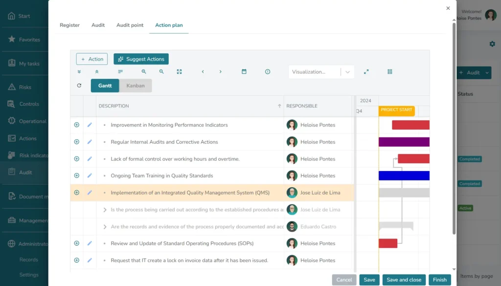 Manage action plans linked to checklist questions with Kanban or Gantt tracking directly within the audit, closing the loop from finding to correction, reducing parallel spreadsheets, and increasing completion rates.