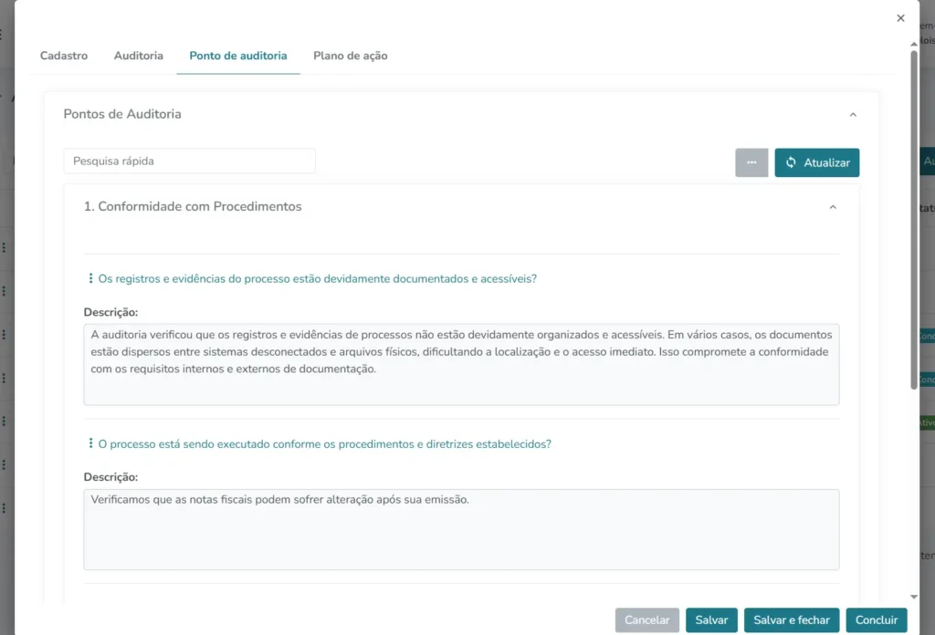 - Os achados são registrados como pontos de auditoria estruturados, com campos configuráveis e obrigatórios quando necessário.