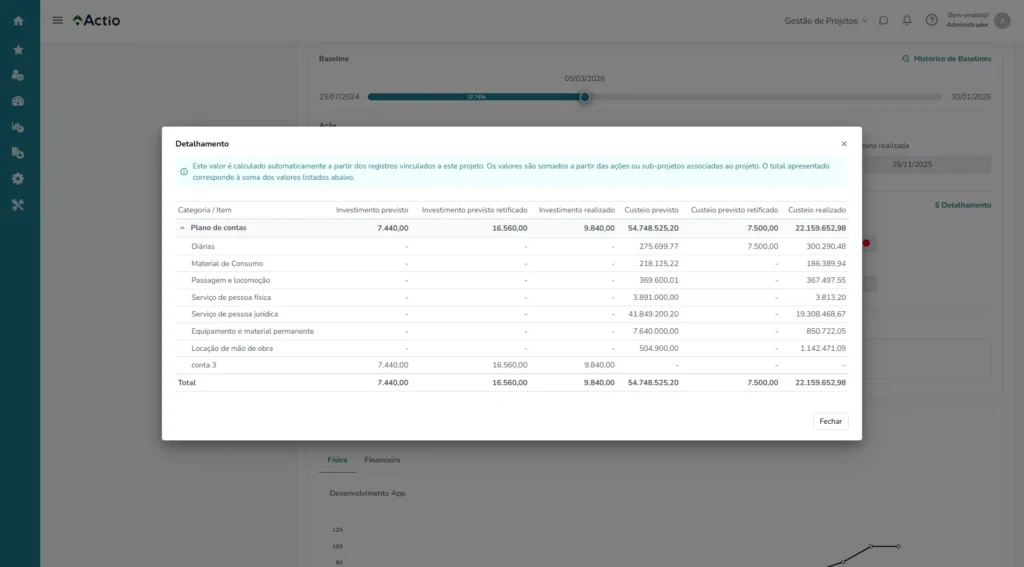 - Planejamento com cronograma e responsáveis em ambiente único; execução acompanhada por indicadores de valor agregado e avanço físico-financeiro em tempo real.