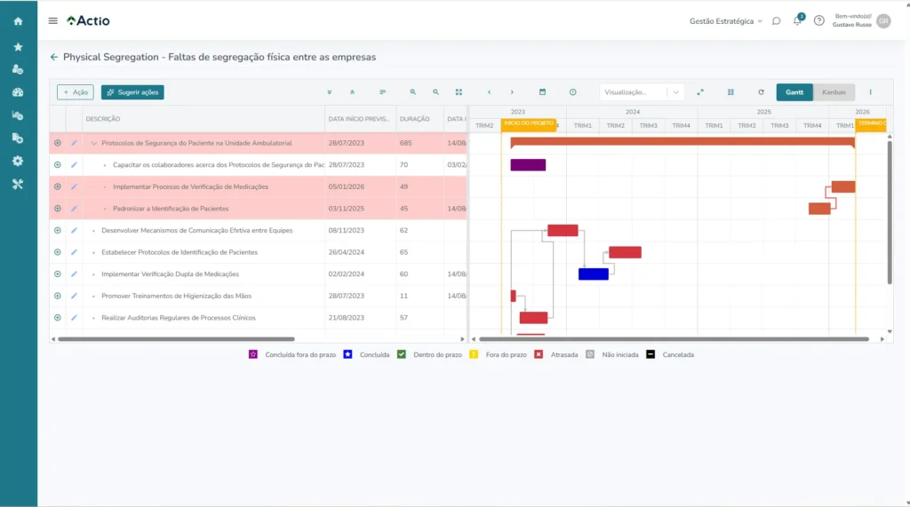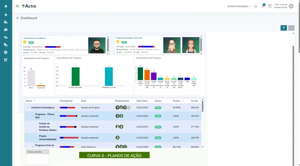 Estruture cronogramas com responsáveis, prazos, dependências e caminho crítico, usando planos de ação integrados, cálculo automático de avanço físico e curva S para comparar previsto e realizado.
