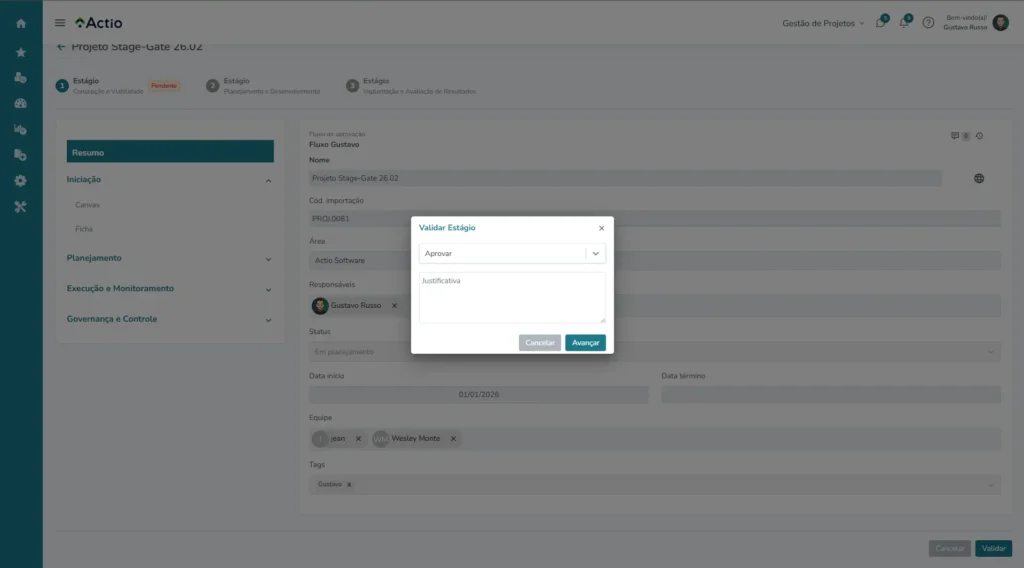Estruture projetos em etapas claras, com possibilidade de preenchimento de campos obrigatórios nas etapas e pontos formais de decisão ao longo do ciclo de vida do projeto. Estabeleça critérios objetivos para avançar, revisar ou interromper iniciativas, garantindo governança para cada fase do projeto.
